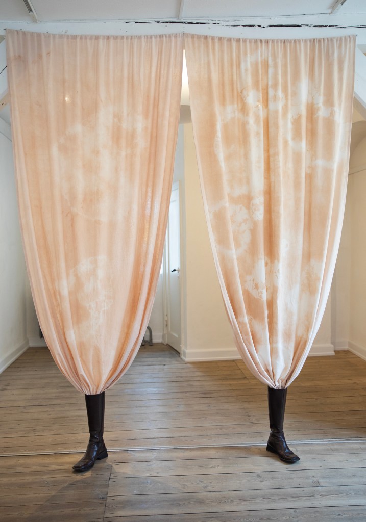 Kvædedans, 2024, textile sculpture 250 x 240: sheets (dyed with quince branches), found brown leather boots.